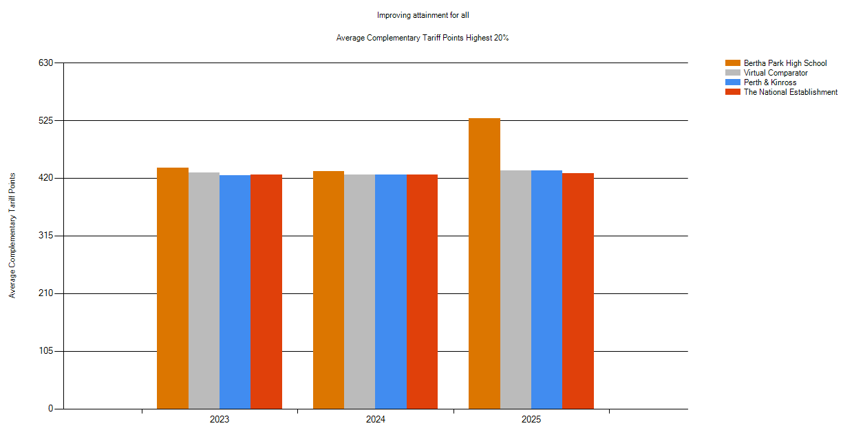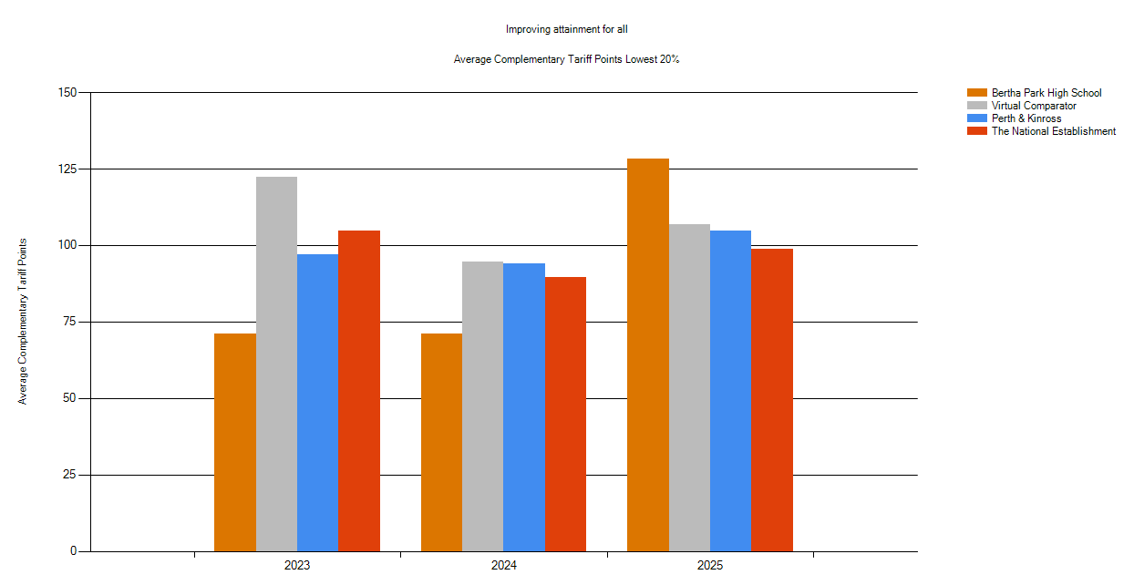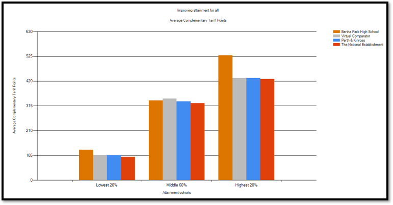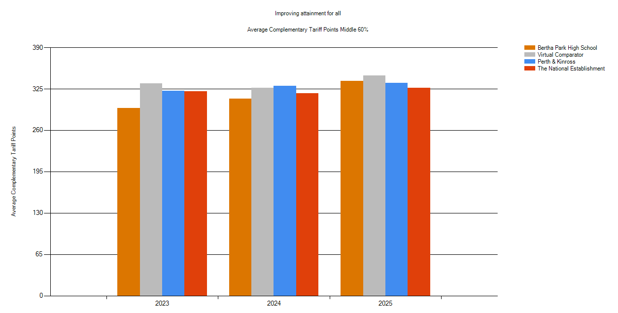 We have plans in place to increase the attainment of this group of pupils to edge above the Virtual Comparitor (grey bar), but the middle attaining 60% of S4 pupils are still getting a very good experience at Bertha Park High.